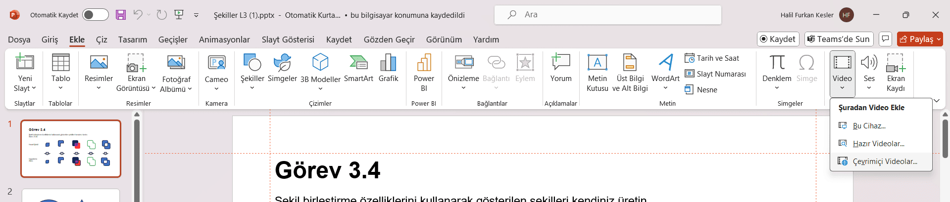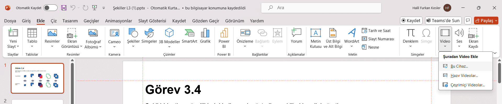PowerPoint’te bir video eklemek için ilk adım, ‘Ekle’ sekmesini kullanmaktır. Menüde ‘Ekle’ sekmesini seçtikten sonra, ‘Video’ seçeneğini bulmanız gerekecek.