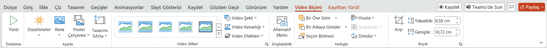 Videonuzu ekledikten sonra, boyutunu ve konumunu ayarlayabilirsiniz. Video çerçevesi ekleyebilir ve kenarlarını düzenleyebilirsiniz. Bu, videonun sunumunuzun genel tasarımına uyum sağlamasına yardımcı olur.