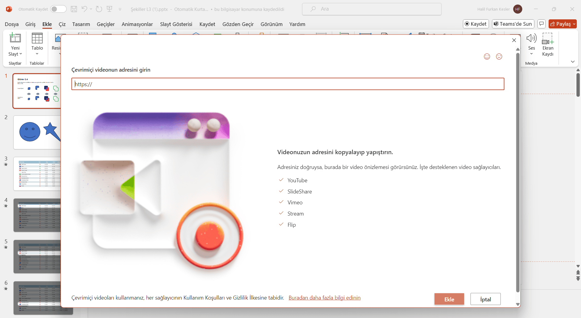 YouTube’dan bir video eklemek için, videonun URL’sini girin ve ‘Ekle’ butonuna tıklayın. Online videolar, özellikle internet bağlantısı olan ortamlarda sunum yaparken kullanışlıdır. Ancak internet bağlantısı gereksinimini unutmamalısınız.