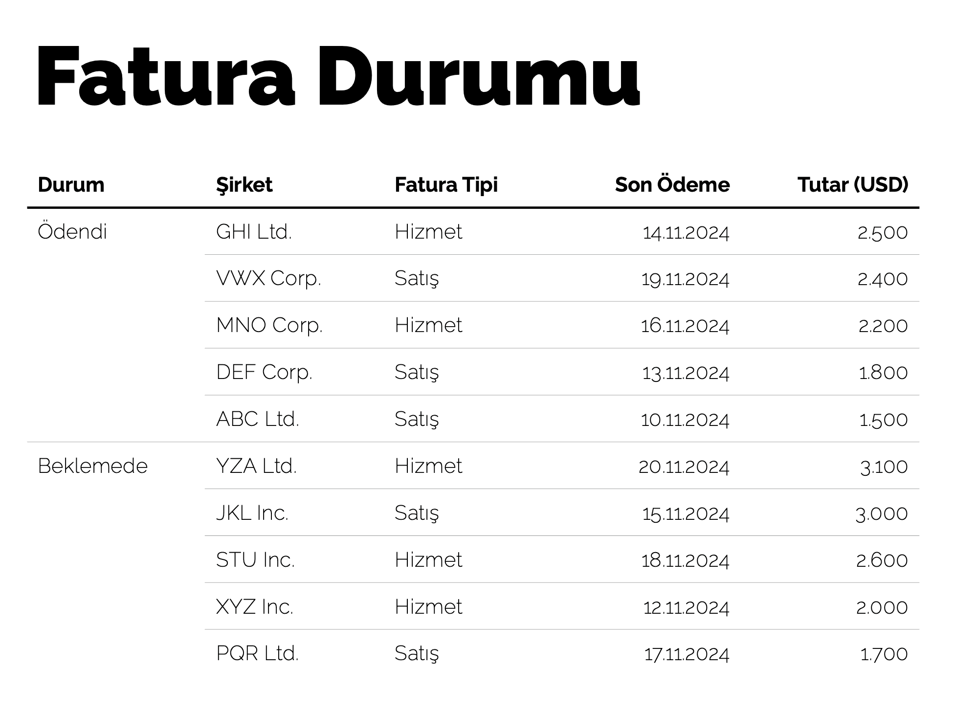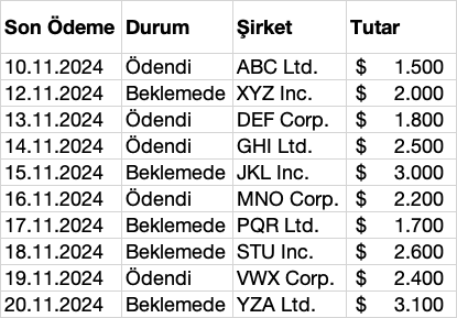 Veya, son ödeme tarihine göre faturaları görmek ve nakit akışını yönetmek istiyorsam; son ödeme tarihini en başa alır, kronolojik sıraya göre sıralarım. Durum ve şirket bilgisini gösteririm. Böylece ödenmeyen ve yaklaşan ödemelerin takibini, firma ve tutar bilgisini vererek kolaylaştırırım.