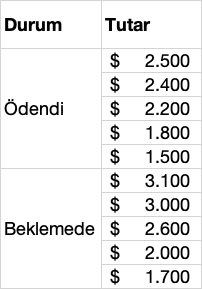 Örneğin; fatura tutarı büyük olan fatura benim için daha önemliyse ve faturaların ödenip ödenmediğini görmek istiyorsam şöyle bir kullanım mantıklı olabilir; durum sütununu en başa alınır, tutar'a göre büyükten küçüğe sıralanır, durum hücreleri birleştirilir.