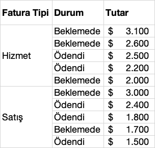 Veya fatura tipine göre ödenip ödenmeme durumlarını görmek istiyorsam; tutar'a göre sıralanır, fatura tipi en başa alınır ve sıralanır ve hücreler birleştirilerek 2 grup oluşturulur. Böylece tüm veri hizmet faturaları ve satış faturaları olarak okunmuş olur.